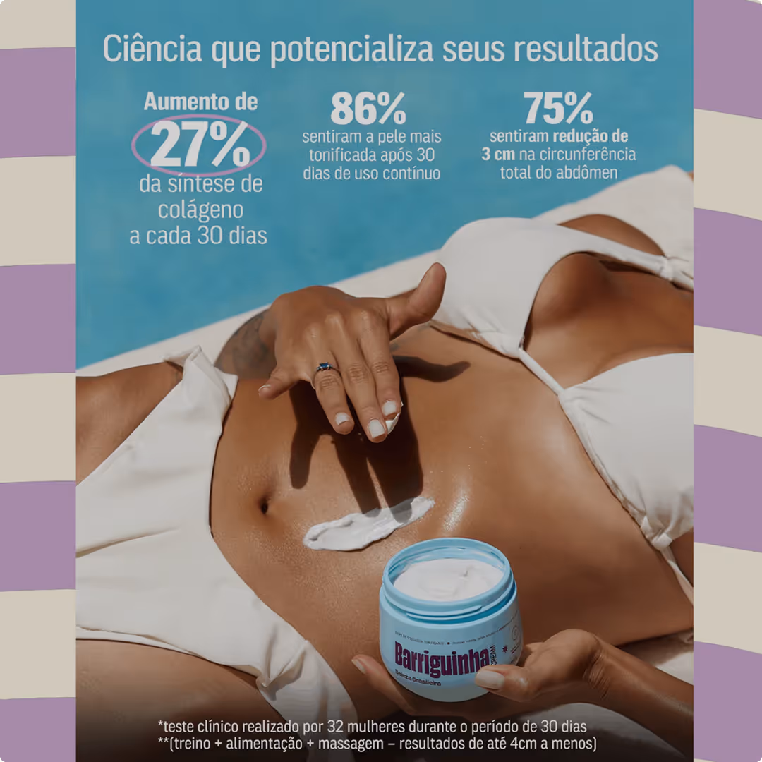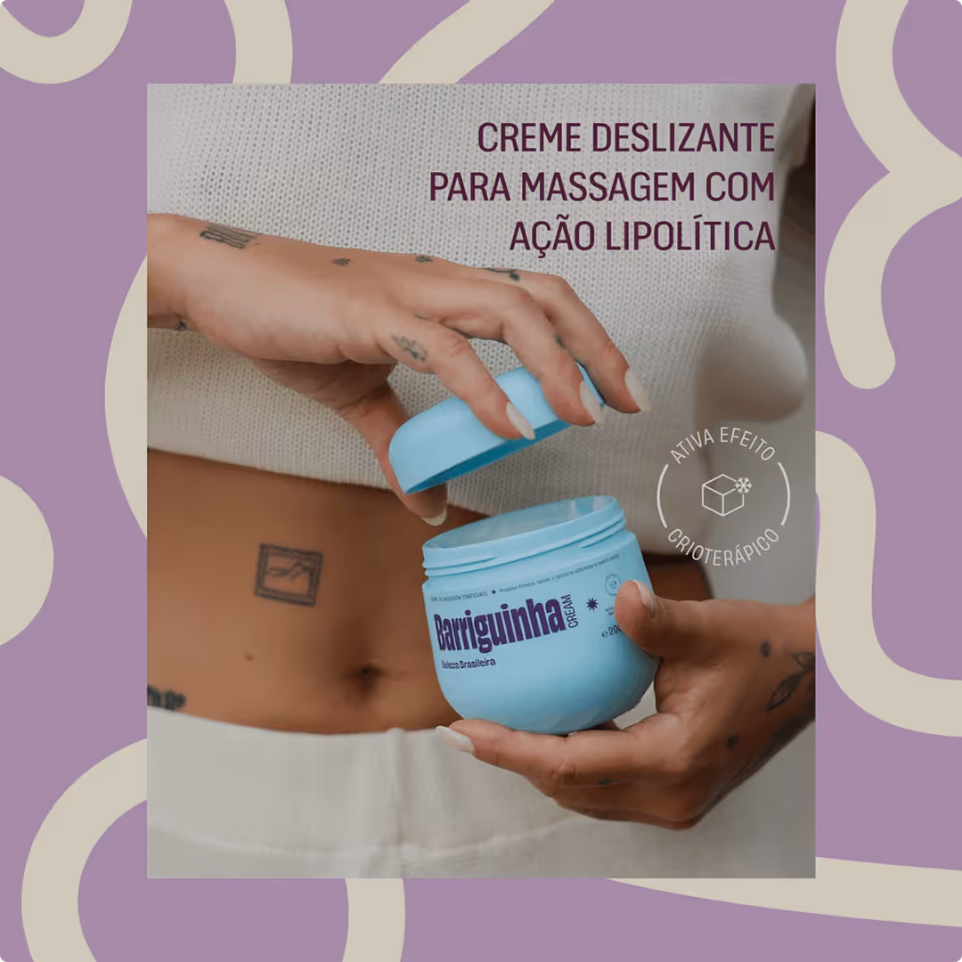 Ao entrar em contato com a pele, o Barriguinha possui os ativos certos que resfriam sua barriga, auxiliando na queima de gorduras localizadas.